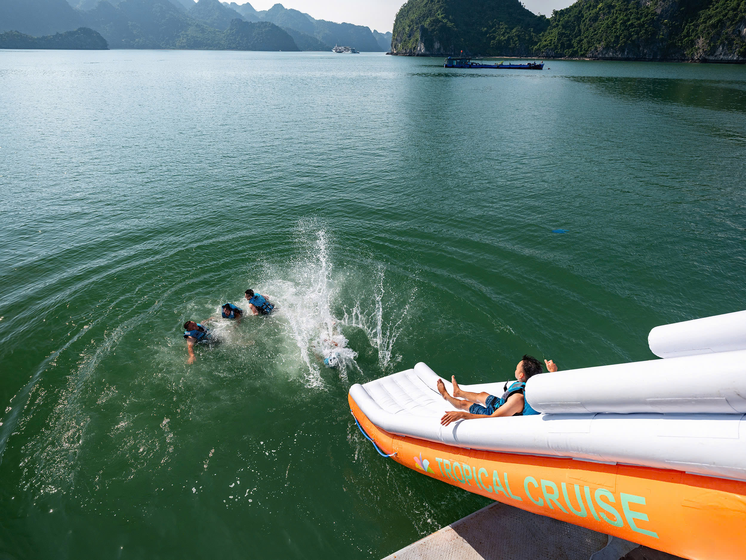 Không chỉ là một chuyến tham quan, đây là hành trình nghỉ dưỡng đẳng cấp giữa thiên nhiên – nơi du khách được tận hưởng cảm giác thư giãn tuyệt đối trên du thuyền sang trọng, kết hợp trải nghiệm chưa từng có: khám phá đảo Cát Bà bằng xe điện xuyên rừng, thăm hang động kỳ vĩ, chèo kayak giữa vịnh Lan Hạ hoang sơ, bơi lội – cầu trượt nước – bể sục Jacuzzi trên boong tàu và thưởng thức tiệc hoàng hôn đầy lãng mạn.
