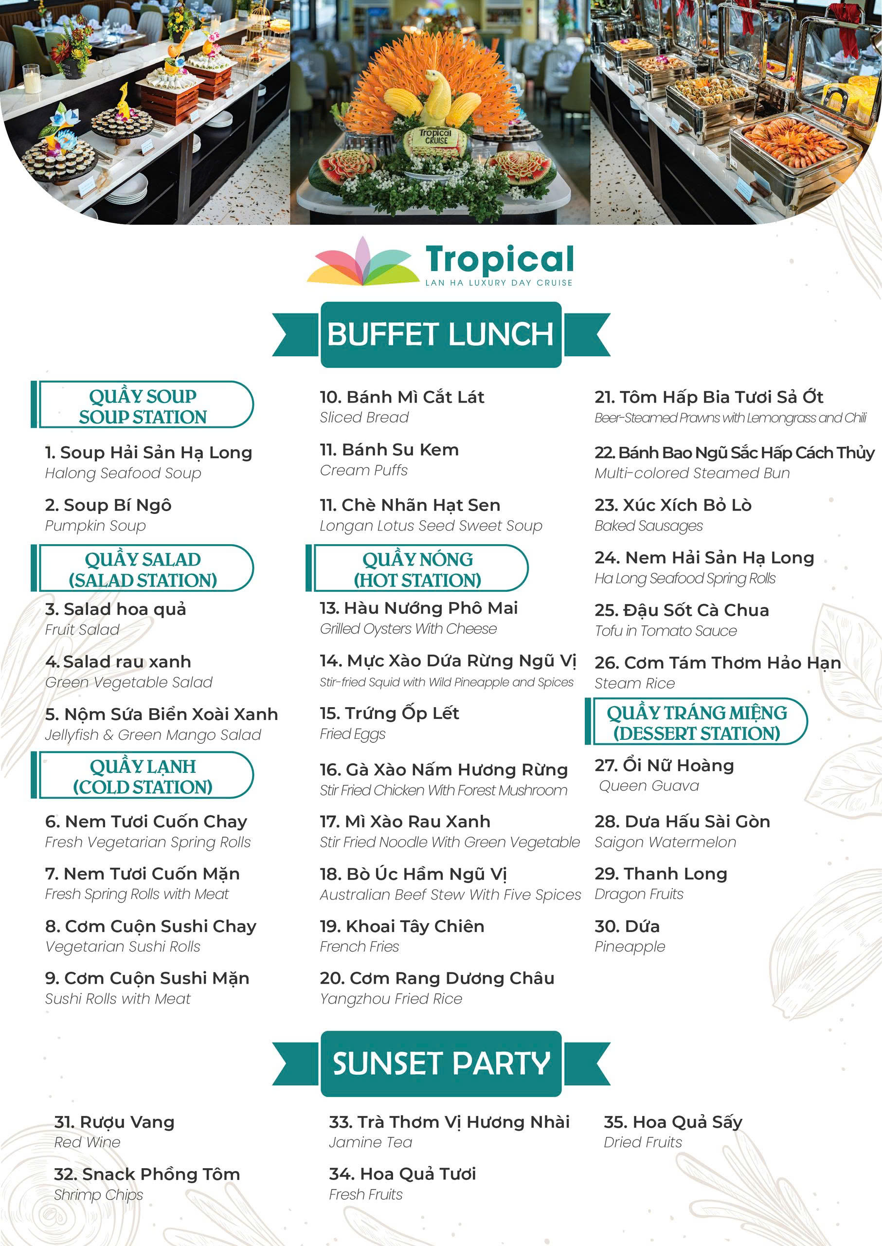 - Thưởng thức tiệc Sunset Party dưới ánh hoàng hôn lãng mạn cùng điệu nhạc, hòa mình vào thiên nhiên, đất trời trong khi tàu quay về bến.
